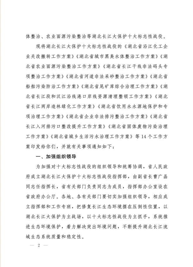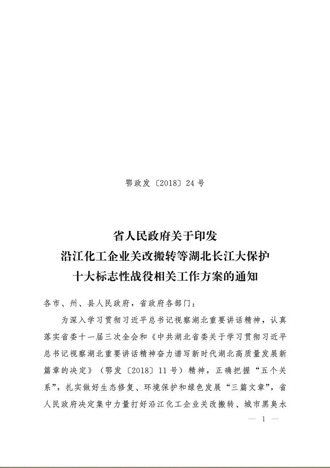 省人民政府关于印发沿江化工企业关改搬转等湖北长江大保护十大标志战役相关工作方案的通知