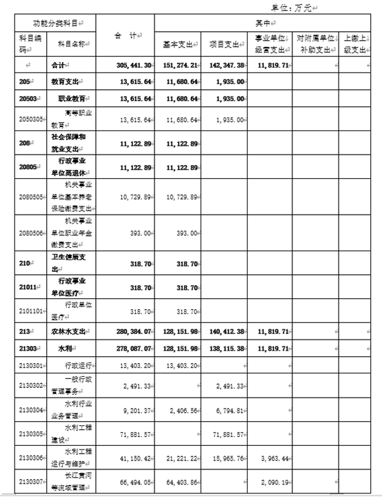 2020年水利厅支出总预算305449.3万元,其中基本支出151274.21万元,项目支出142347.38万元,事业单位经营支出11819.71万元。