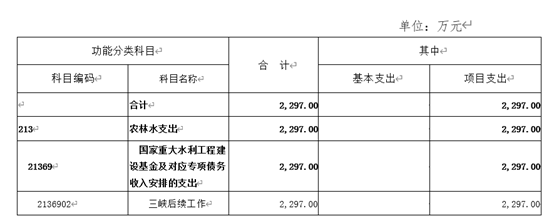 2020年省水利厅政府性基金预算2297万元,为中央政府性基金转移支付资金,用于三峡后续工作。
