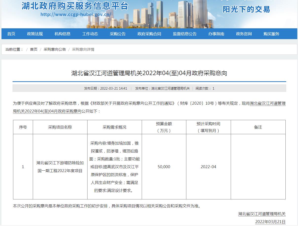省汉江局2022年04(至)04月政府采购意向